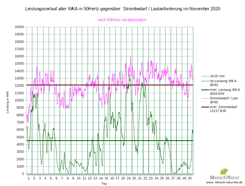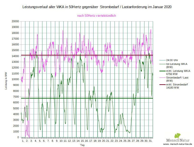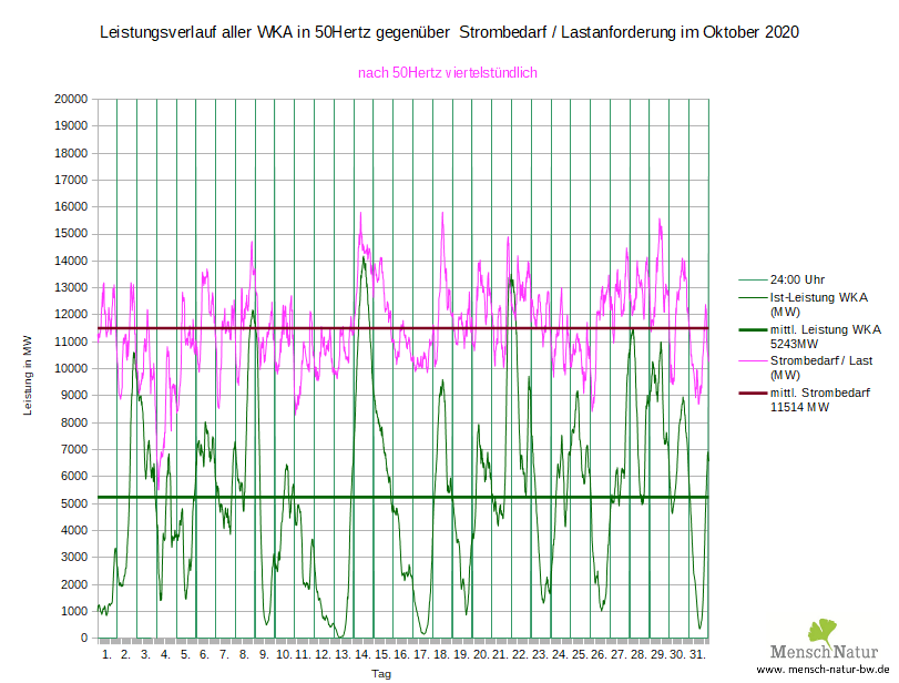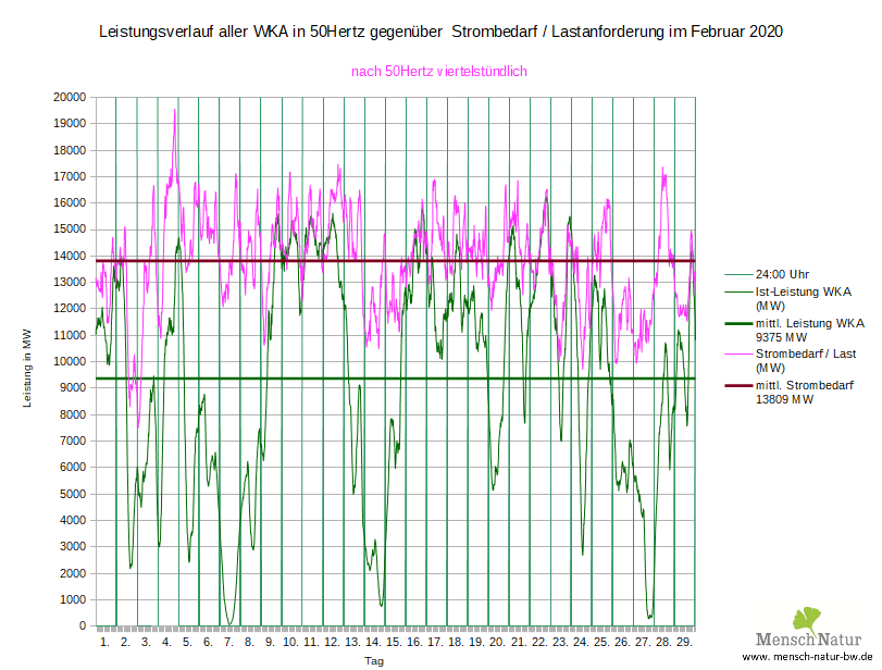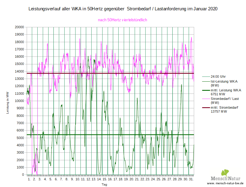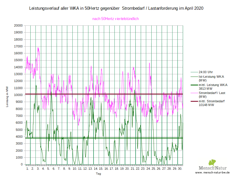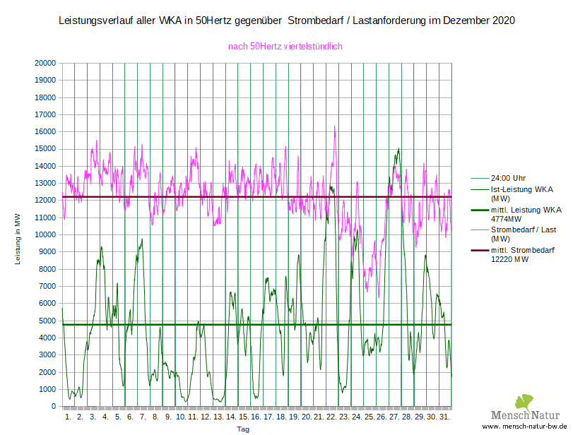 Vergleich Leistungsverlauf Windleistung gegen Strombedarf (Lastverlauf) Land + See