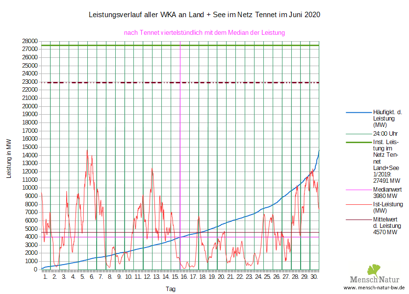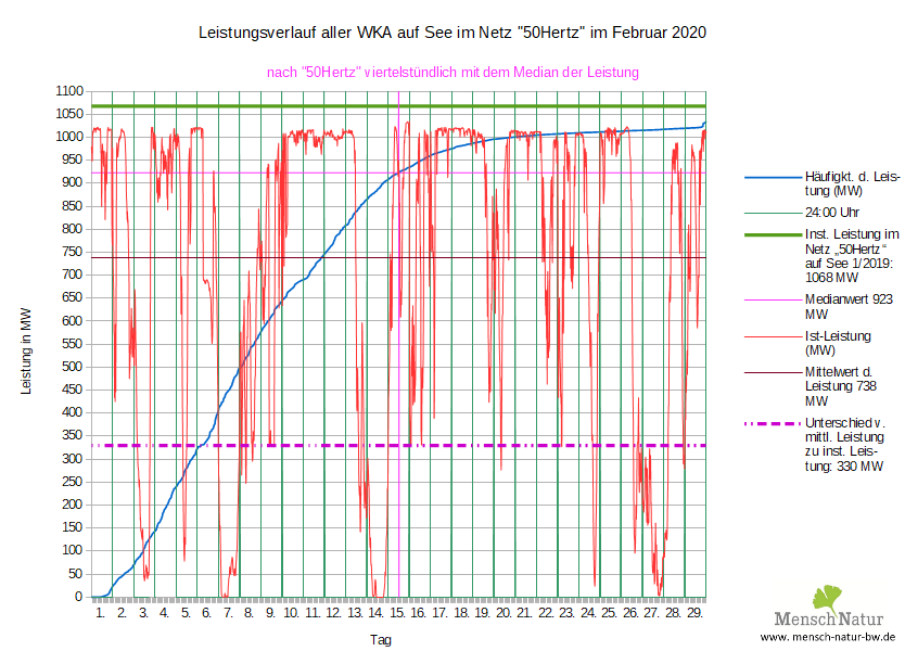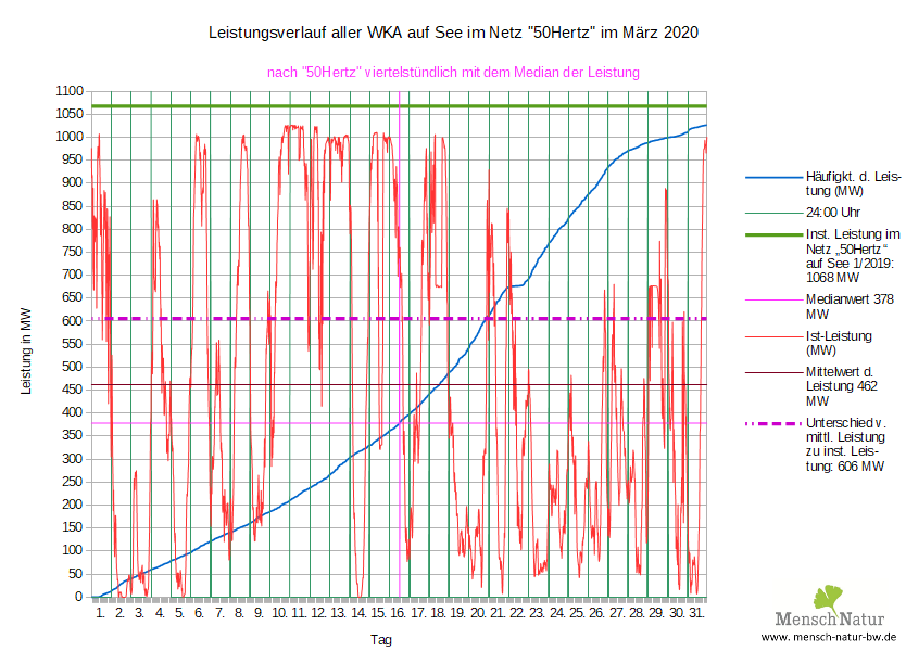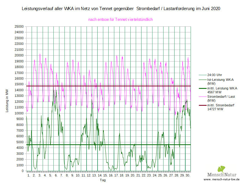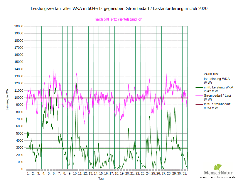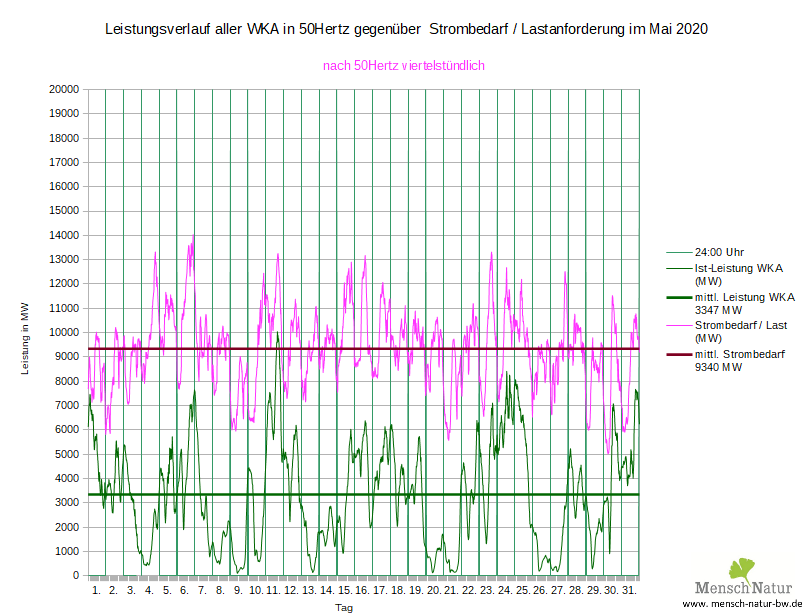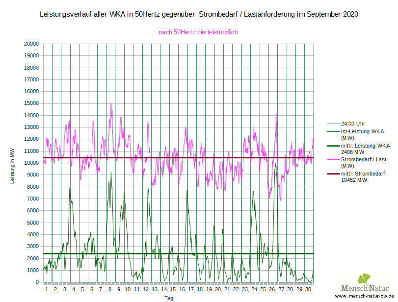 Vergleich Leistungsverlauf Windleistung gegen Strombedarf (Lastverlauf) Land + See