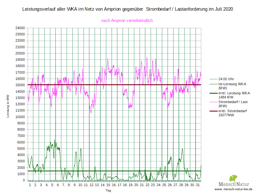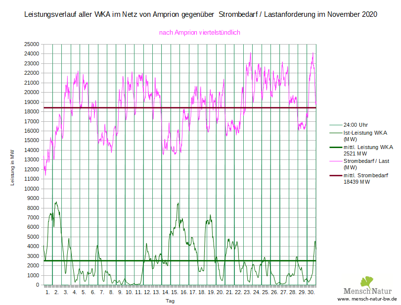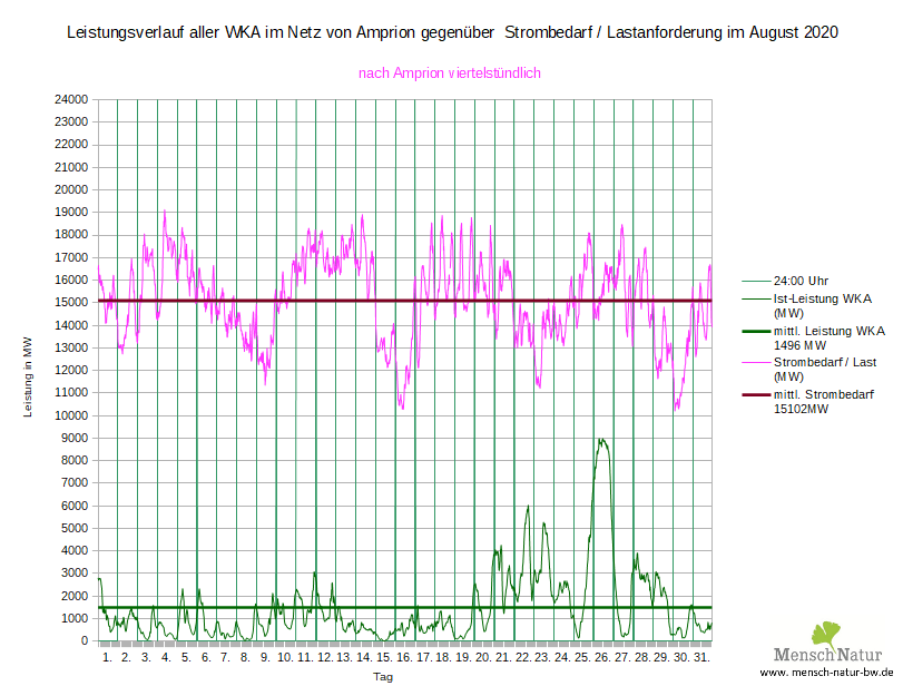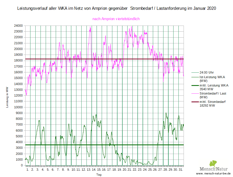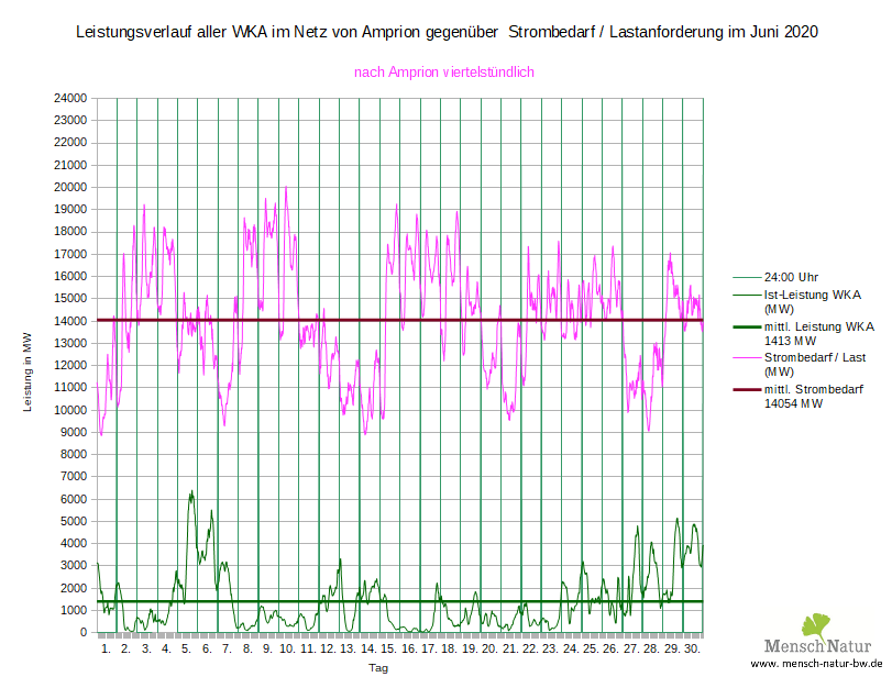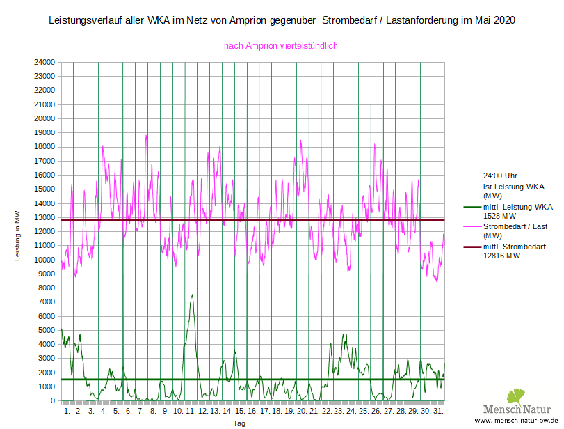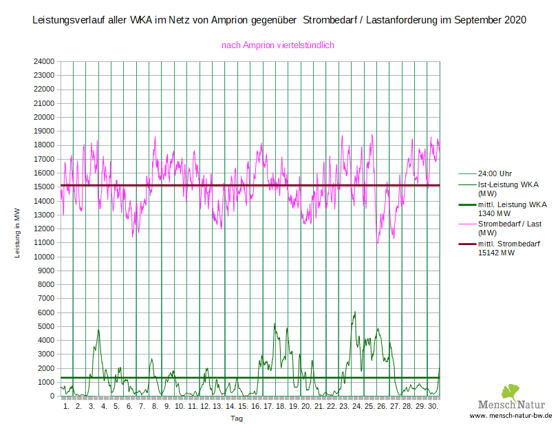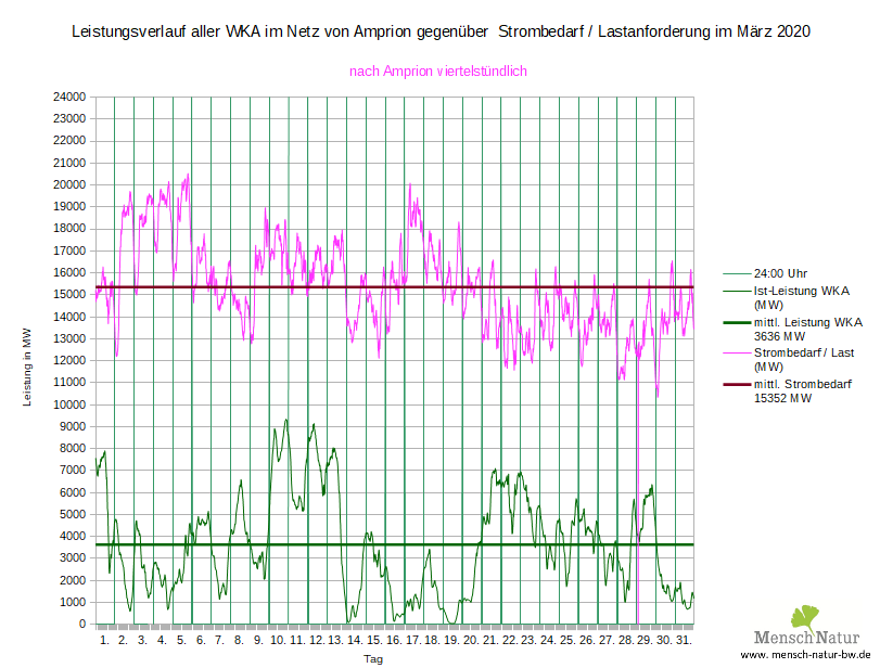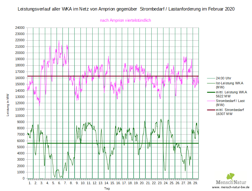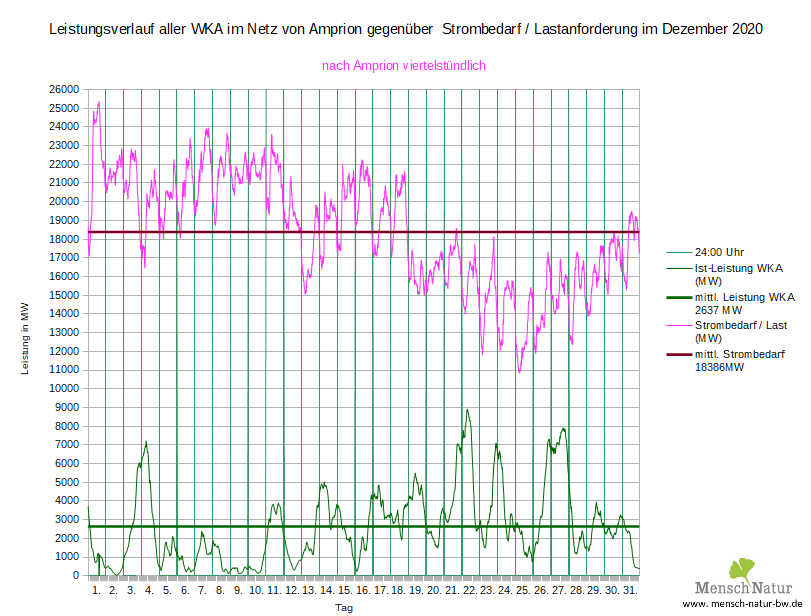 Vergleich Leistungsverlauf Windleistung gegen Strombedarf (Lastverlauf)