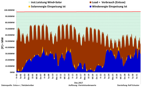 Auf dieser Seite finden Sie die Grafiken zur Ist-Einspeisung von Wind- und Solarstrom im Verhältnis zum Stromverbrauch (Last) fürdas Jahr 2017. Die Schaubilder lassen sich durch Mausklick öffnen.