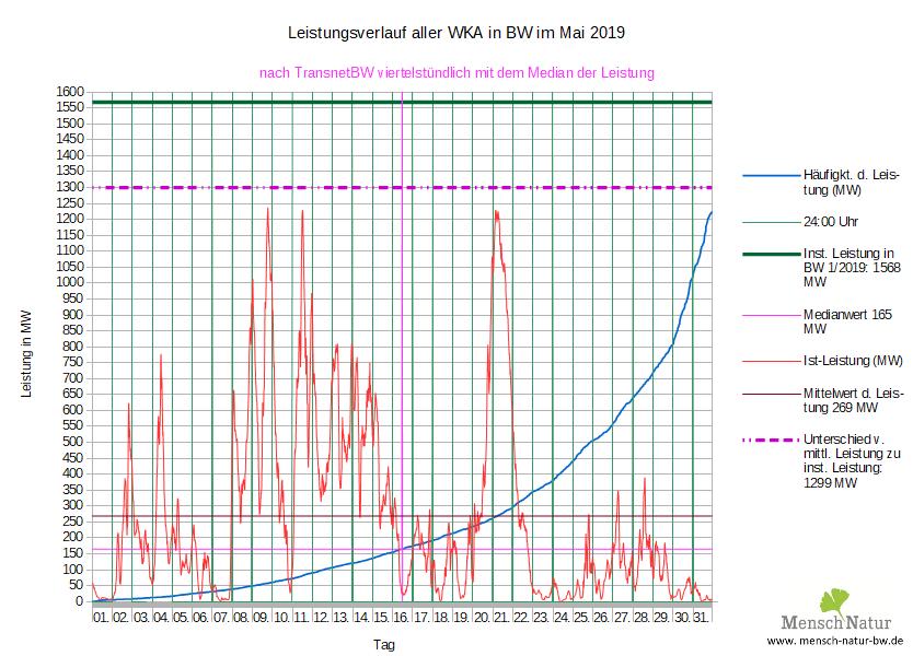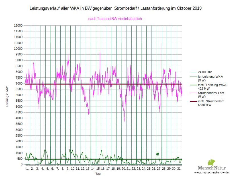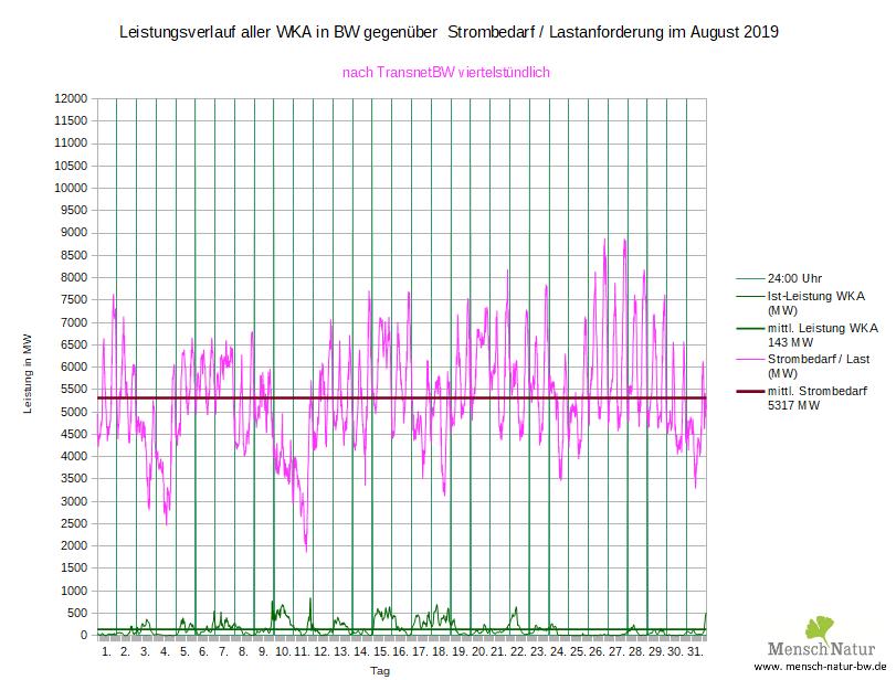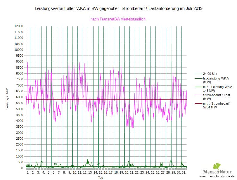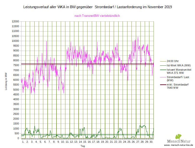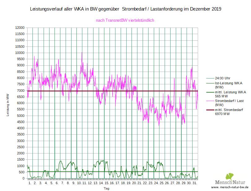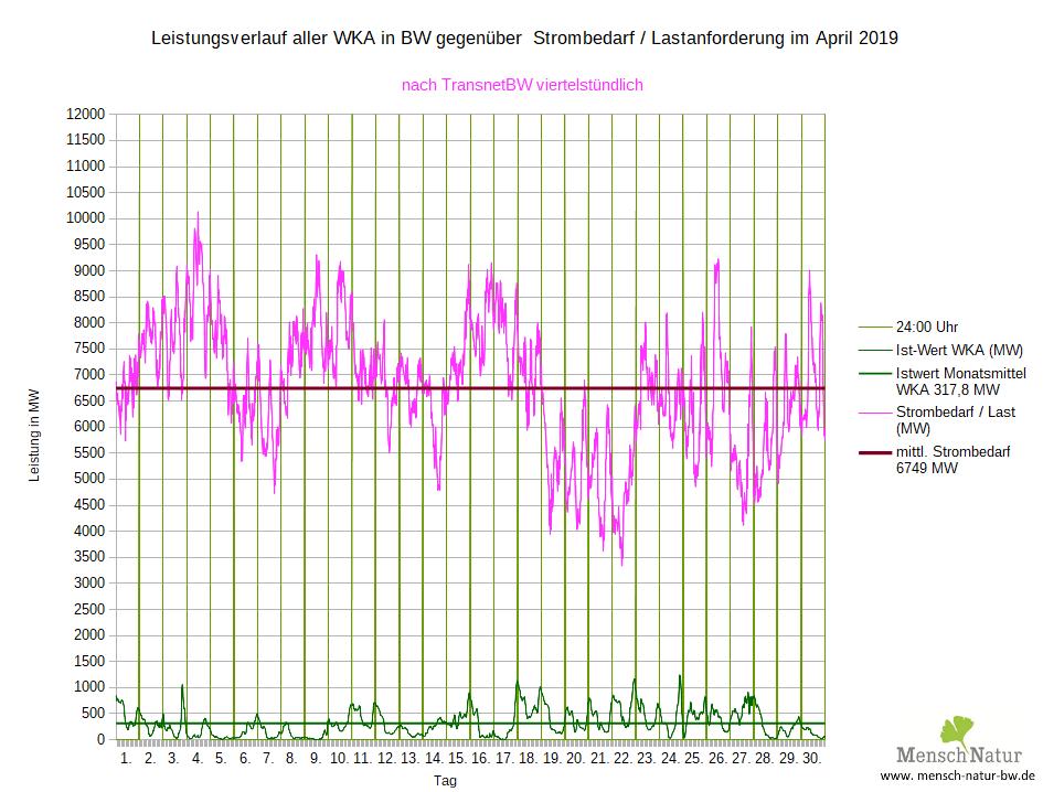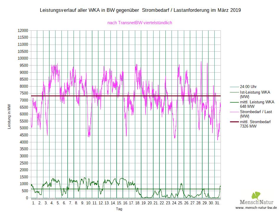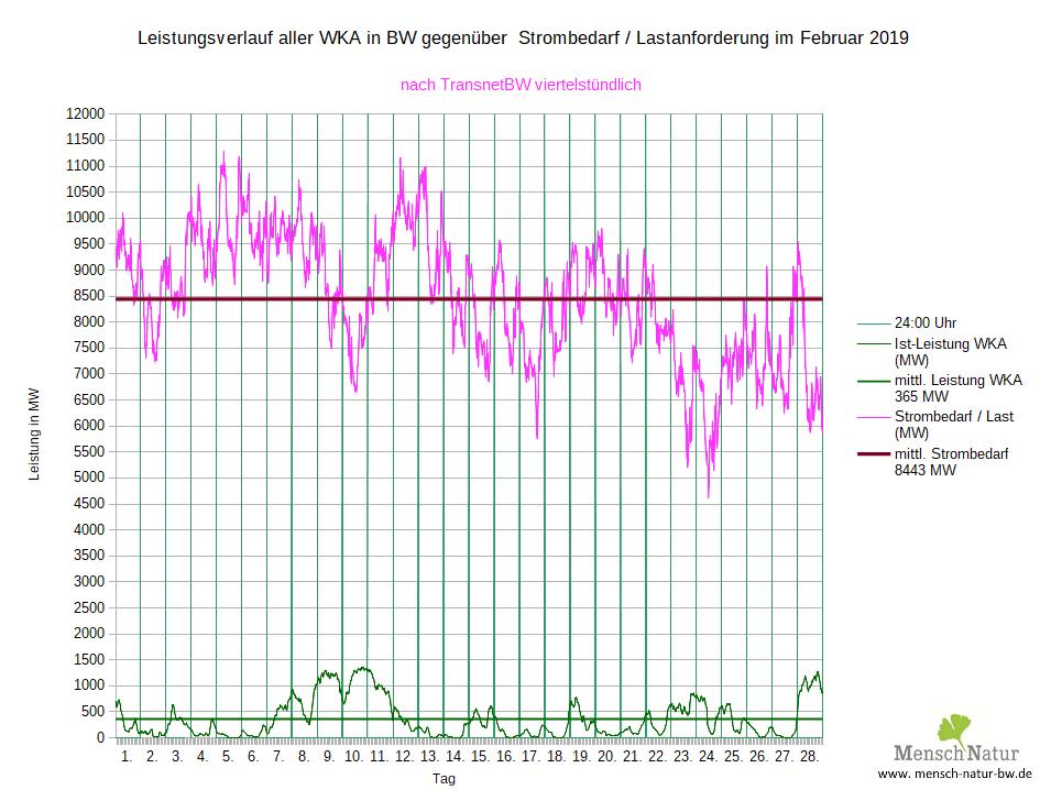 Vergleich Leistungsverlauf Windleistung gegen Strombedarf (Lastverlauf)